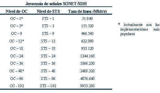 las relaciones entre los niveles OC, STS y SDH. La señal de