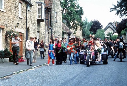 Summer solsticeworshipers arrive at Midsomer Barrow on motorbikes to celebrate