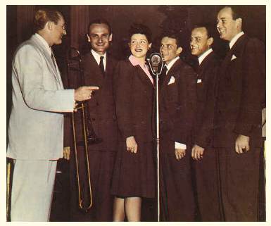label... Tommy Dorsey By the end of the year, the group is down to a foursome (Jo Stafford, her then husband John Huddleston, Chuck Lowry and Billy Wilson) and they are asked to join Tommy Dorsey's orchestra in Chicago. Not much later, another young singer is hired to replace Dorsey's "boy vocalist" Jack Leonard. His name? None other than young, skinny Frank Sinatra, with whom the Pipers record quite a few hits during their time with TD's ork. The most memorable among these are chart-toppers "I'll never smile again" and "There are such things" as well as "Stardust", "It started all over again", "Oh! Look at me now" and two-sided "Let's get away from it all" (latter two with Connie Haines). The group's first commercial recording with their new boss is made on February 1st 1940: "What can I say after I say I'm sorry?", an oldie from the 1920's. On Labor Day that same year Billy Wilson is replaced by Clark Yocum, who had been Dorsey's guitar player since April 1940. Lead singer Jo Stafford also makes a number of solorecords with TD, of which the first is "For you", released on a 12-inch disc. In the summer of 1941 she has a big hit with the spiritual-like "Yes indeed", a duet with Dorsey arranger Sy Oliver.