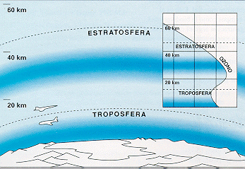 | El ozono forma un frágil escudo, en apariencia inmaterial pero muy eficaz. Está tan esparcido por los 35 km. de espesor de la estratosfera que si se lo comprimiera formaría una capa en torno a la Tierra, no más gruesa que la suela de un zapato. La concentración del ozono estratosférico varía con la altura, pero nunca es más de una cienmilésima de la atmósfera en que se encuentra. |