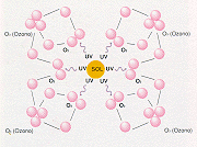 El ozono es una forma de oxígeno cuya molécula tiene tres átomos, en vez de los dos del oxígeno común. El tercer átomo es el que hace que el gas que respiramos sea venenoso; mortal, si se aspira una pequeñísima porción de esta sustancia. Por medio de procesos atmosféricos naturales, las moléculas de ozono se crean y se destruyen continuamente. Las radiaciones ultravioletas del sol descomponen las moléculas de oxígeno en átomos que entonces se combinan con otras moléculas de oxígeno para formar el ozono. |