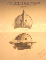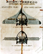 Este dibujo de Paulet, de 1902, muestra, en una vista frontal de su Avión Torpedo, las dos hileras de cohetes a cada lado de la cabina. Cuando el avión cohete despega, y está en vuelo vertical, los cohetes, sujetos a la estructurade punta de lanza, apuntan hacia abajo.