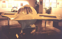 Este modelo del Avión Torpedo de Paulet muestra claramente las hileras de cohetes bajo el triángulo con forma de punta de lanza, y la cabina ovoidal y sus ventanillas. (Puede apreciarse el busto de Paulet en la parte superior izquierda de la fotografía)