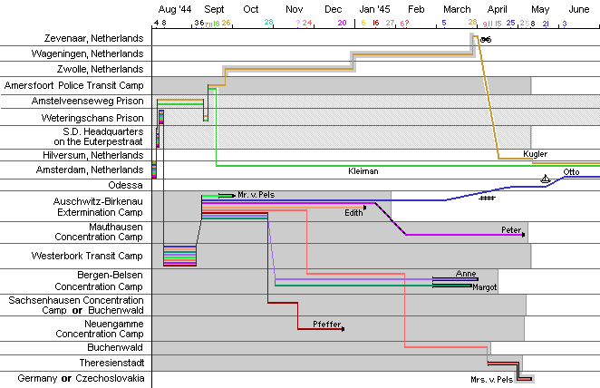 After the Diary: Where They Were Taken Anne's diary ends on 1 August 1944. She did not write entries every day. On the 4th of August, the secret Annex was raided. Two of the helpers were taken away as well as everyone who was hiding in the secret annex. This graph maps out the places they were taken (etc.) with the dates. Of the people who had been in hiding, only Otto Frank survived the concentration camps. (All of the helpers survived, and the two who were taken away were not sent to concentration camps.) |