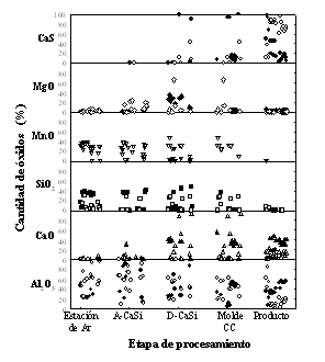 La población de inclusiones consistió básicamente de silicatos de Mn, que evolucionaron hacia aluminatos de calcio a medida que avanzó el proceso. Las fases secundarias en las inclusiones complejas siguieron de manera general la misma tendencia, excepto que en el producto final se caracterizaron por presentar contenidos significativos de CaS.