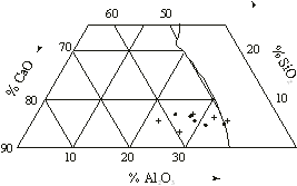 Fig. 8. Localización de la composición química de la escoria en el diagrama Al2O3-SiO2-CaO-10% MgO. Los símbolos rellenos y + denotan las condiciones en la estación de Ar y después de la adición de CaSi respectivamente