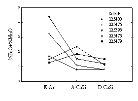 El grado de oxidación de las escorias utilizadas, representadas por (%FeO+%MnO) oscila entre 1 y 2 durante el tratamiento del metal líquido en el horno olla.