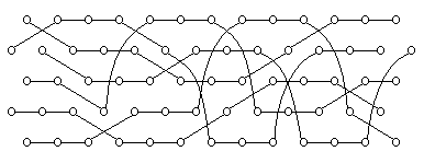 Back16 Club Chocolate BoxThe following causal diagram is for a 16 club version of the chocolate box. The second and the fourth lines represent the feeders. The feeder on the second line starts with four clubs. All the feeders' passes are straight and the feedees' passes are crossed. There's a lot going on on the middle of this pattern, so if it's going to work the passes and the timing would have to be spot on!