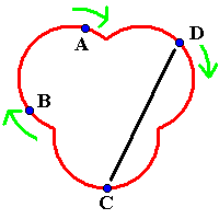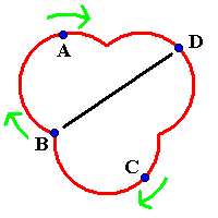 Now C passes with B. This is B's first pass as the feeder, so now B stands still and C starts to move along with A and D. This diagram is just like the first one, except all the jugglers have moved around. |