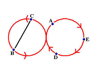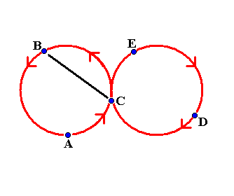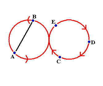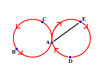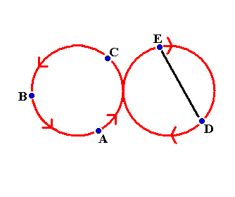 ambulant diagram IVW WeaveI learned this beautiful pattern at EJC2007 in Athens. Five jugglers, A, B, C, D and E walk around in a figure of eight pattern. On one side of the pattern they pass on two count and on the other side they pass on six count. Each juggler only passes with two other jugglers. B starts juggling two count and his first pass is with A, C starts self, self and D and E start self, self, self, self. This is shown in the next diagram. The arrows show how the jugglers move.