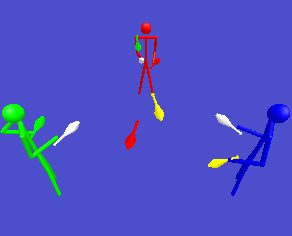 Home magic contents previous nextGeometric Countdown FeastEveryone does a geometric countdown, that's four count, two count, one count, two count. You pass to everyone in turn including yourself. So the actual sequence for each juggler is six count, one count, six count, two count, three count, four count, three count, two count. The six count passes are always yellow clubs, the three count passes are always green clubs and the other passes are always red clubs. Also eveyone has a white club which is always a self.