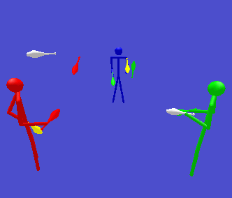 Home magic contents previous nextMixed ability feed #2Blue feeds on funky bookends (pass pass self pass heff), red passes maybe (pass pass self zip heff) and green passes five club why not? (pass self zip heff zip). Blue passes red and yellow clubs with red and he passes green clubs with green. Blue's self are always yellow clubs and red's selfs are always red clubs. Blue's heffs are always green clubs. Red and green have white clubs that they never pass. In this animation blue throws straight passes and red and green throw crossing passes.