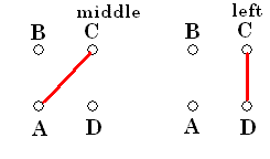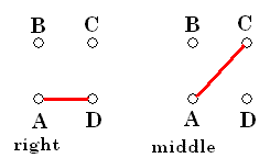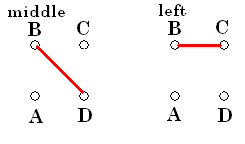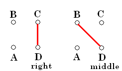 The next feeder, D, is to the last feeder's left. D passes to the right and then to the middle: