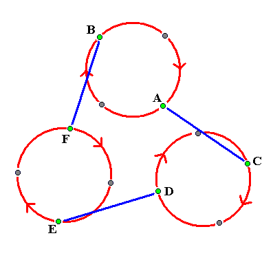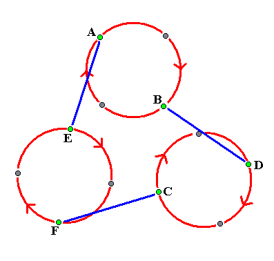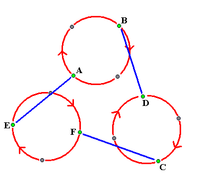ambulant diagram Electric RazorThis is a classic pattern for six jugglers. It can be juggled on a three count, a four count or a six count. Pairs of jugglers walk round each other in one of three circles and they make two passes each to one juggler from one of the other circles. For the first pass A passes with C, B passes with F and D passes with E: ![]() The jugglers then move in the direction of the arrows, and the second passes are between the same jugglers as the first, but in different positions: ![]() Again the jugglers move in the direction of the arrows, but for the third pass A passes with E, B passes with D and C passes with F: