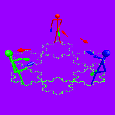 Home magic contents backTrinityRed juggles JED's nightmare, blue juggles the antiquasar and green juggles a double three count feast. The colour codings for each juggler are the same as those for each individual pattern! Also on each pass you exchange the same colour clubs.