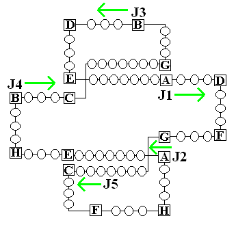 BackMovable Feast With a TwistIn the diagram jugglers are shown as J1, J2 etc. and are shown in their initial positions. Arrows show the direction they move. Labelled squares show places where each juggler passes. The pass is made to the square with the same label ('A', 'B', etc.). Unfilled circles show self throws.