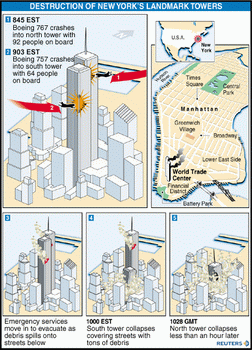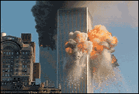 ๐๘.๔๕ น. เครื่องบินเที่ยวบินหมายเลข ๑๑ ของสายการบินอเมริกันแอร์ ไลน์ บินชนตึก เวิร์ลด์ เทรด เซนเตอร์ สูง ๑๑๐ ชั้น ที่นครนิวยอร์ค