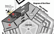 - ภาพแผนที่ตึก ภาพจำลองเหตุการณ์ของเครื่องบินพุ่งชนตึกเพนตากอน กระทรวงกลาโหมอเมริกัน กรุงวอชิงตัน ดีซี