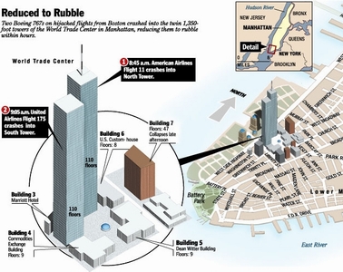 - ตึก World Trade มีสองตึก แต่ละตึกจะมี 110 ชั้น ตึกย่อยๆ อีก 5 ตึกเล็ก