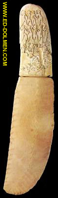 Data del predinástico y se compone de una hoja con retoques paralelos y un mango de marfil con decoraciones en relieve.