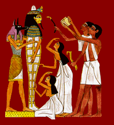 Procesión por el Nilo, y una vez en el borde del Nilo, la momia, la comitiva y el ajuar funerario son trasladados en barcas desde la orilla oriental (el mundo de los vivos) hasta la orilla occidental (el mundo de los muertos).