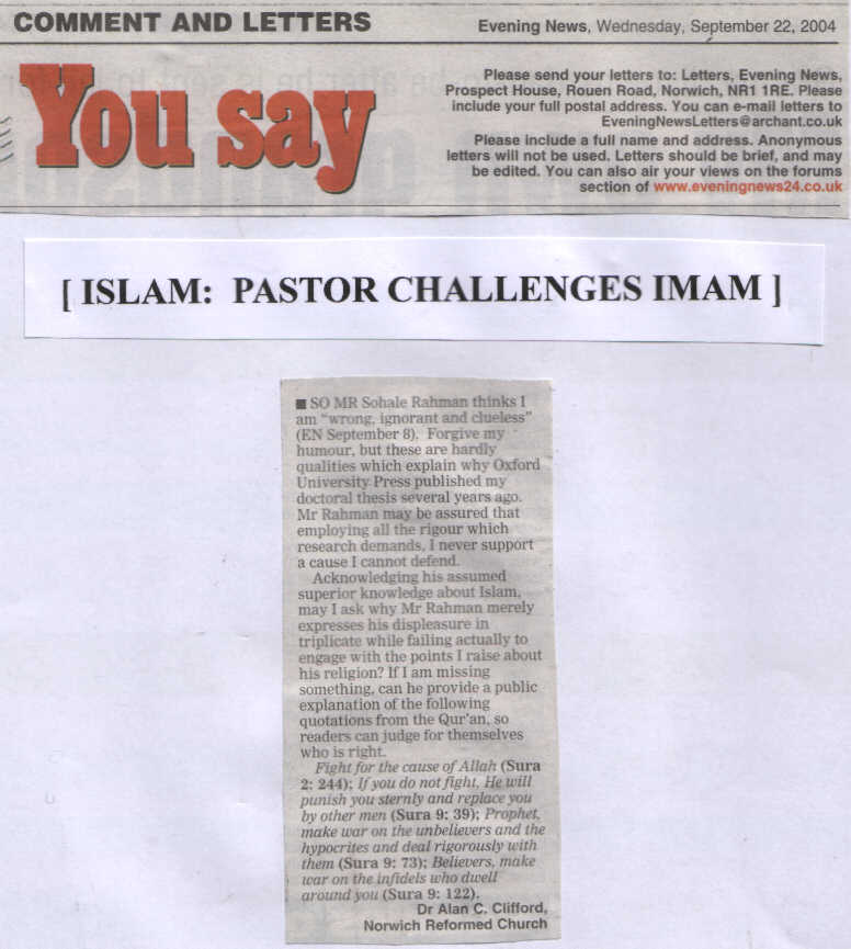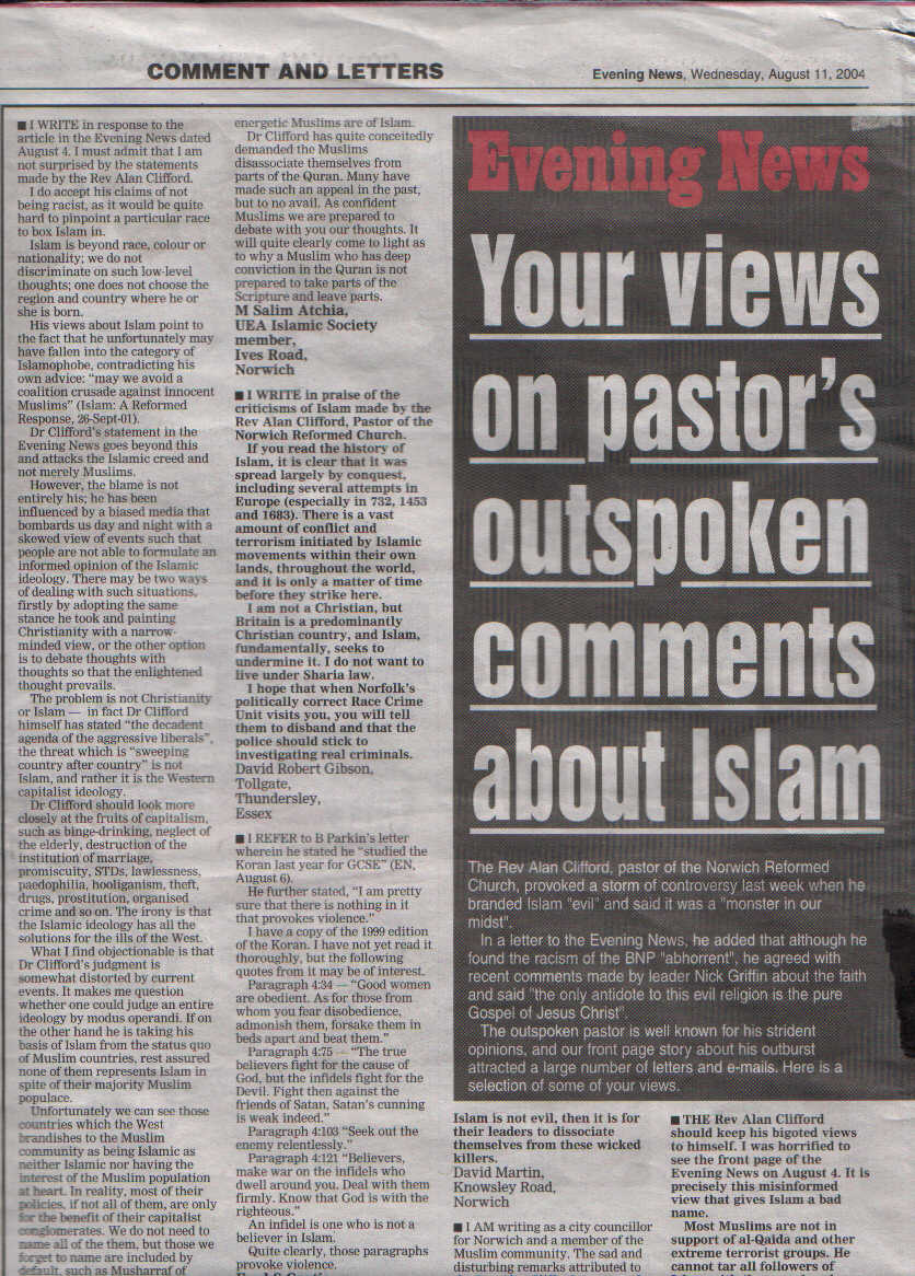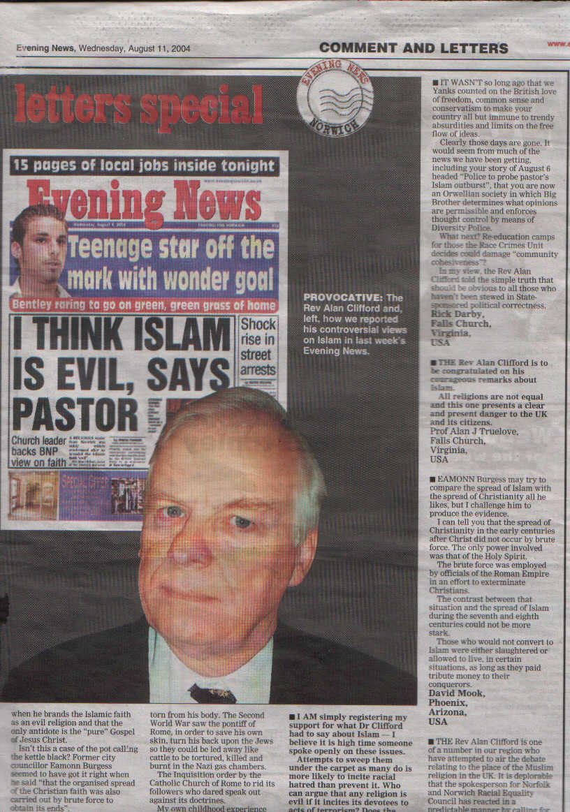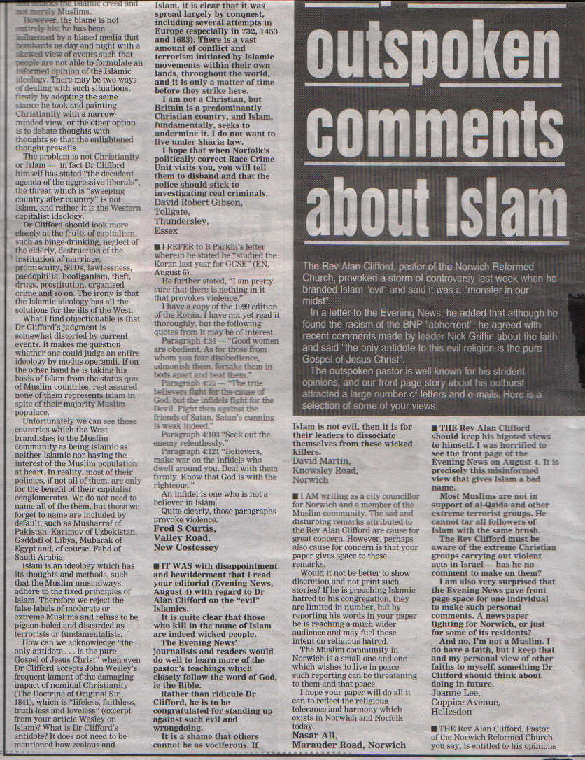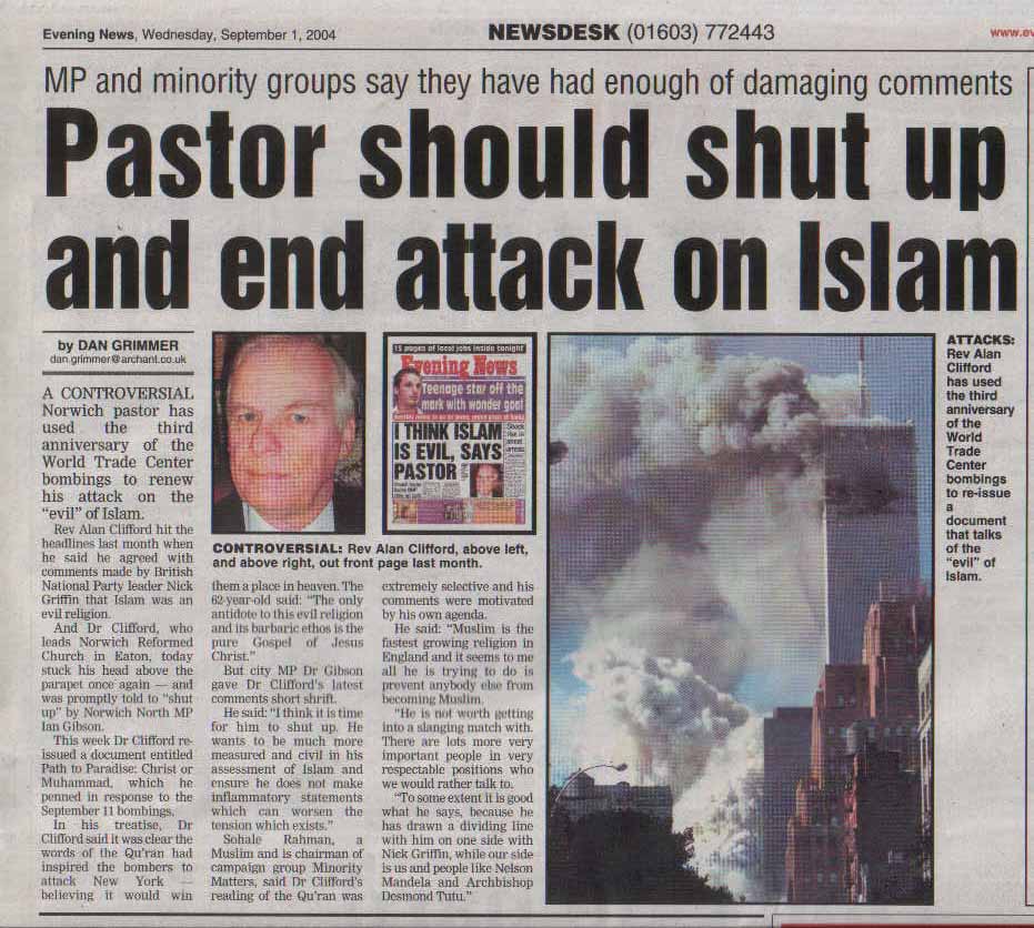 A CONTROVERSIAL Norwich pastor has used the third anniversary of the World Trade Centre bombings to renew his attack on the "evil" of Islam.Cliffords Response: