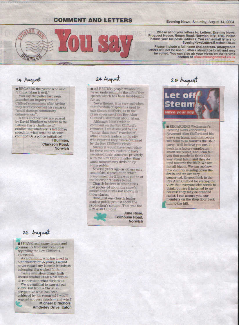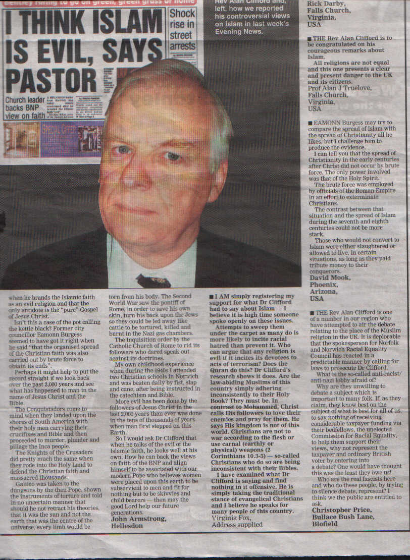While trying to distance himself from the BNP, who he describes as "abhorrent", the Norwich evangelical pastor echoed its leader's views on Islam in a letter to the Evening News.