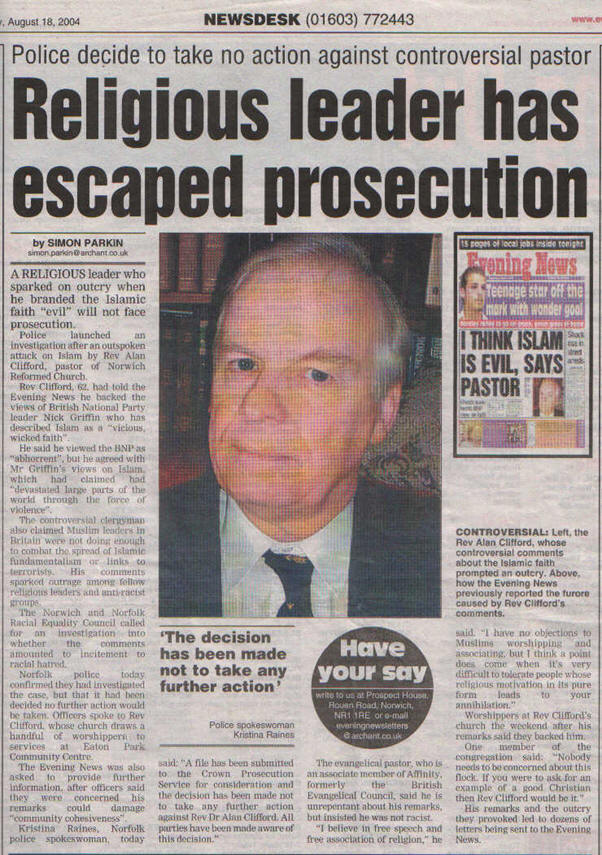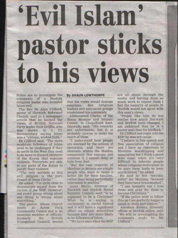 POLICE today launched an investigation into comments by a Norwich religious leader branding Islam "an evil religion".The Rev Dr Alan Clifford, pastor of Norwich Reformed Church, yesterday told the Evening News he backed the views of BNP leader Nick Griffin, who was shown in a TV documentary telling party members Islam was a "vicious, wicked faith."