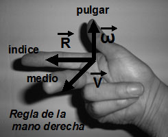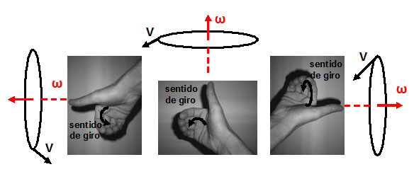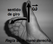 La velocidad angular está representada por un vector perpendicular en el centro de la circunferencia y cuyo sentido se determina por la "regla del tirabuzón de Maxwell", también conocida como regla de la mano derecha.