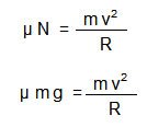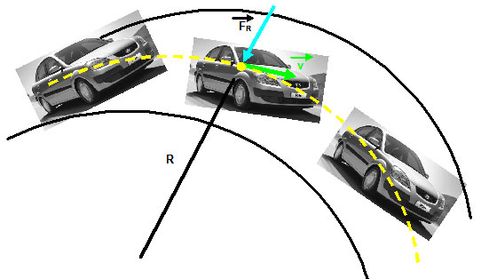 Supongamos que tenemos un automóvil de masa m que se dispone a doblar en una esquina de radio R con un coeficiente de roce entre el piso y las ruedas ? que es la que impide que el automóvil se deslice o derrape