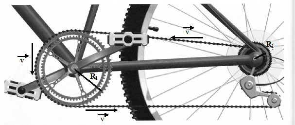 Si llamamos R1 al radio del engranaje del plato y R2 al radio del engranaje del piñón de la rueda trasera y consideramos un punto situado en la cadena al pasar por el engranaje del plato tendrá una rapidez angular igual a