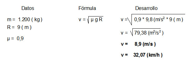 Determinar la rapidez máxima con que debe girar en una esquina un automóvil de 1200 kg donde el radio de giro es de 9 metros, sabiendo que el coeficiente de roce entre el pavimento y los neumáticos es de 0,9