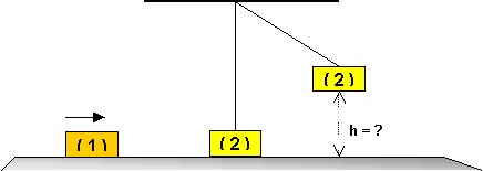 11.- Un bloque (1) de 5 (kg) que se mueve a 5 (m/s) choca elásticamente con otro bloque (2), de igual masa, que cuelga de un hilo cuyo peso es despreciable en comparación con el peso de los cuerpos. Suponiendo que no existe roce, calcular la altura que alcanza el bloque (2).