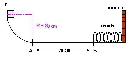 23.- Un cuerpo de 2 (kg) de masa se suelta desde el punto más alto de un tobogán de 80 centímetros de radio, deslizándose hacia abajo sin roce, golpeándo finalmente a un resorte fijo a una muralla,tal como se muestra en la figura