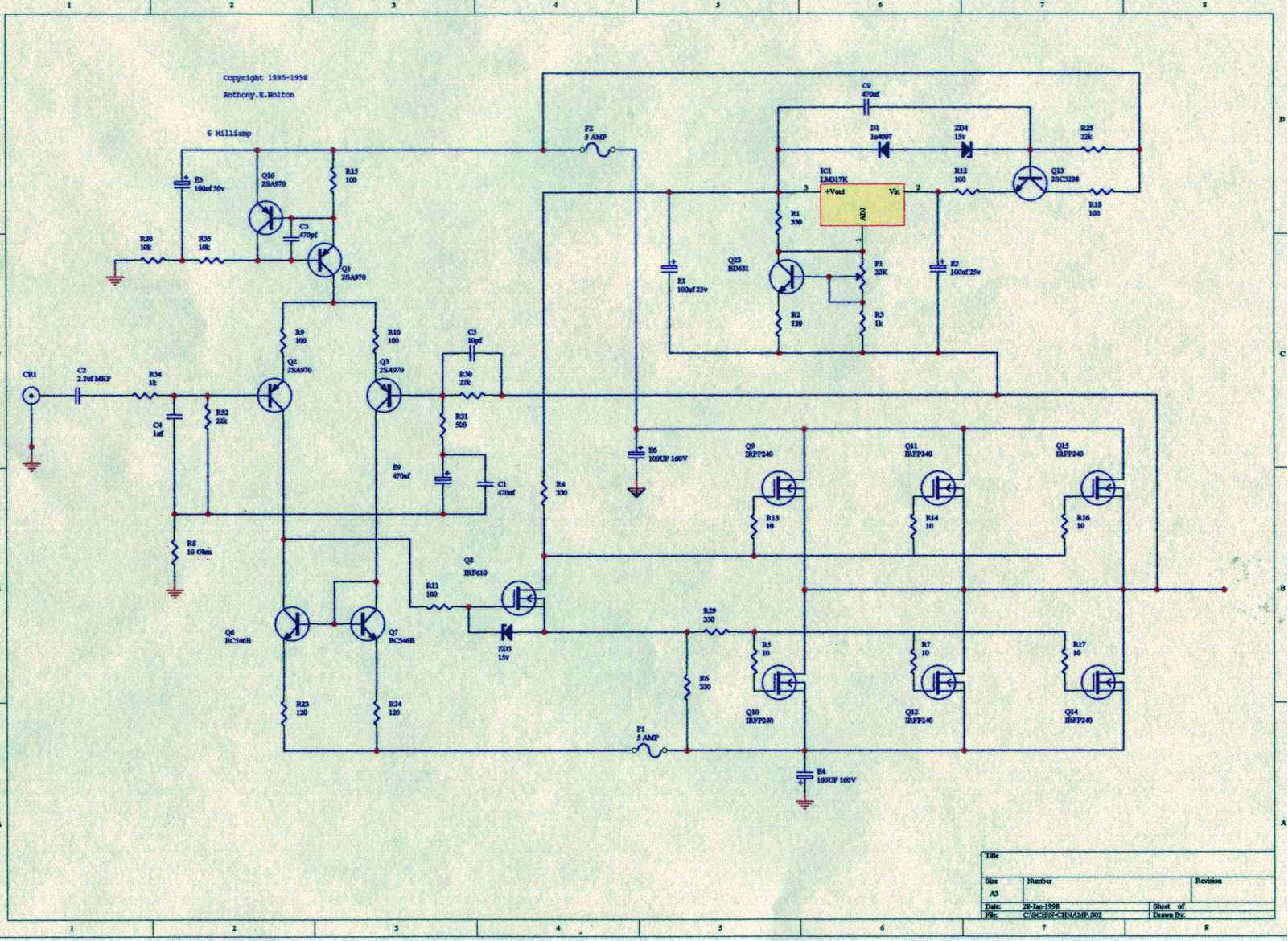 The Amplifier featured below is a quasi complementary HEXFET N-Channel Power Amplifier. It develops 260 Watts RMS into 8 Ohms and over 400 Watt RMS into 4 Ohms. The main advantage in having a quasi complementary MOSFET Output stage is that the selection of output devices is huge. This design allows the use of almost any industrial power MOSFET available. The sound quality is absolutely magnificent, having very high detail, excellent instrument separation even at high SPL's, deep sound stage, smooth clean Mid to High range sound. |
