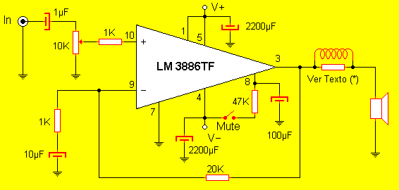 La señal de audio proveniente de la placa de sonido entra al amplificador operacional por su pin 10 (entrada no inversora). Un capacitor de 1µF deja pasar sólo la señal de audio, bloqueando la componente DC que pudiese existir. Un potenciómetro de 10K (opcional) permite ajustar el límite de entrada. A la salida una resistencia de 20K realiza la realimentación por medio de la entrada inversora mientras que un conjunto RL acopla la salida de potencia con el parlante. Este conjunto consta de una bobina de 10 a 15 vueltas de alambre 1.5mm sobre una resistencia de 10 ohms / 2 watts. Dos electrolíticos desacoplan la fuente de alimentación y un jumper controla la función Mute (enmudecer) la cual se activa abriendo el interruptor. El capacitor de 100µF junto con la resistencia de 47K hacen las veces de retardo de entrada, evitando ruidos al conectarse la alimentación.