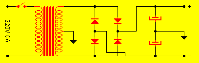 Los diodos son de 100V / 8A y pueden ser remplazados por un puente rectificador. Los capacitores electrolíticos son de 10000µF / 50V. El transformador es de 220V en su primario y 50V en su secundario con punto medio y 6A de corriente para una configuración cuadrafónica.