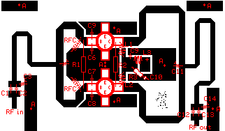 Todas las bobinas marcadas como BI sin del tipo impresas, las cuales están dibujadas en la plaqueta por medio de pistas de cobre. RFC (uno en cada base) son choques de RF convencionales. CH es una bobina de 2 vueltas de alambre 1.5mm sobre ferrite para choques. Las bobinas L (una en cada colector) están formadas por 3 vueltas de alambre 1.5mm sobre aire de 9mm.