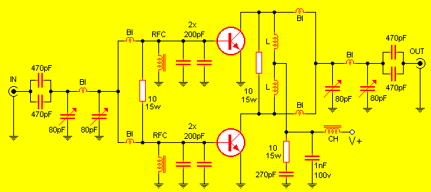 El centro de este proyecto son dos transistores de potencia de RF de la firma Philips Semiconductors BLX15, funcionando en configuración paralelo. Las únicas tres resistencias del sistema deben ser de 10 watts y de carbón, ambos transistores deben estar debidamente disipados a fin de no sobrecalentarse.