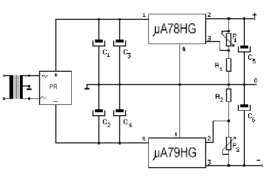 El circuito es sencillo debido a la utilización de dos reguladores de tensión los cuales proporcionan al montaje alta fiabilidad, robustez y características casi inmejorables. Uno de los reguladores (µA78HG) se encarga de la rama positiva y el otro (µA79HG), se encarga de la rama negativa.