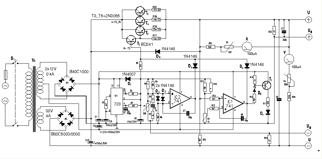 La alimentación de 12V está constituida por Tr1 un rectificador en puente B1 y dos condensadores C1 y C2. La tensión de referencia será suministrada por el µA723 (IC1), los componentes asociados a él se han elegido para proporcionar una tensión de referencia de 7'15V. Esta última aparece en la unión R4/R5 (R en el teórico), R15/R16 y R9 e IC2 (IC2 en el teórico).