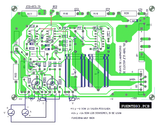 Finalmente ajustemos los potenciómetros P3 y P4 los utilizaremos como potenciómetros de ajuste para calibrar la tensión y corriente de salida que podremos visualizar por medio de los galvanómetros dispuestos a tal fin.