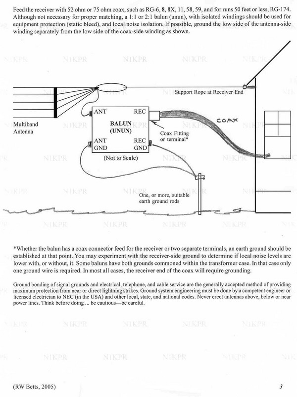 It should be noted that the transformer is hung from the antenna insulator close to the junction of the elements and the ground wires are heavy gage copper or flat copper braid. If a tower is utilized or even a metal mast, the ground should already exist at the attachment point of the support rope. Antenna height above ground is a matter of the installation's facility, convenience, and experimentation. At the beta site location, minor difference was noted in overall signal strength between 12 feet and 45 feet elevation, with a little gain noticed at the highest position, on the higher bands. The differences on the 49, 41, 31, and 25 meter bands, 12 to 25 feet above ground seemed to be the point of diminishing returns. |