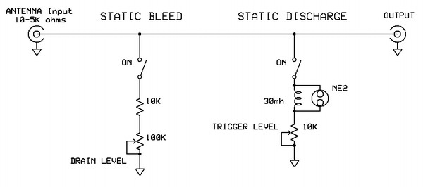 | There are some very orthodox, time-honored, rudimentary ways to deal with the DC static electrical charge that builds up on antennas, and the RF electrical, near-field, transients that become induced into the antenna system. Although this would apply to any antenna, especially those which are outside a building, for end fed antennas in particular, this application is more that an option - it's an absolute necessity - for listening convenience, equipment protection, and of course, personal safety. However, these features are usually built into a receiver, are of fixed value, and pretty much transparent to the user. | ||||||||||||||||