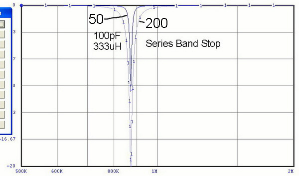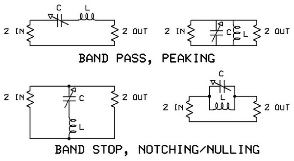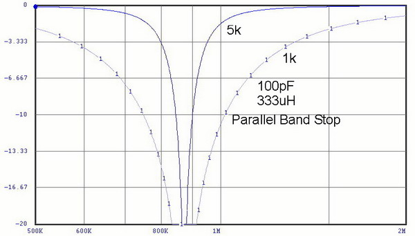 | The same effects can be seen in the Band Stop filters. The difference here is that the series-tuned filter is now used in the "shunt" mode where it is across the signal path. Consequently, working in a higher impedance circuit, its effects are greater. | |||||||||||||||||||||
