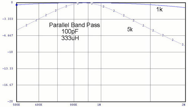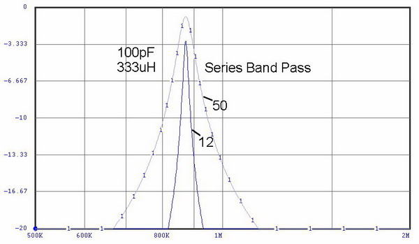 | Here are two ways to provide Band Pass filtering. Note the two important design parameters that these graphs illustrate: Impedance and configuration affect performance. In the series tuned circuit, the filter Q rises as the circuit impedance drops. The opposite is true for the parallel (tank) circuit. Rule: Impedance is minimum in a series-tuned circuit and max in a parallel tuned circuit when at resonance. (curve numbers represent the impedance of the circuit loop - equal input and output impedances) |