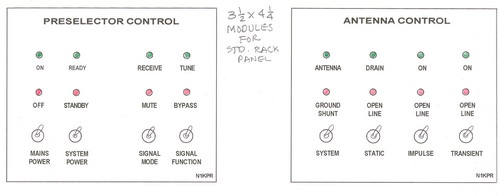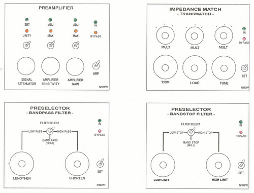 | These six modules (described in RED)are designed to be mounted in an equipment rack. Also, any one may be used alone or in combination with any other modules. Preselector Control: is pretty self-explanatory. It allows the entire system to be bypassed for comparison purposes or when not needed. Signal Mode grounds all RF activity and thus provides an RF-Mute. The Antenna module provides various level and functions of static protection utilizing, bleed resistors, Neon bulb discharge, MOV supression and other forms of Transorbs. The Preamp has an attenuator, an input level control to preclude overload/intermod, and an actual gain control. The Transmatch is either a "T" or "Pi" filter which can tame any "wild" antenna impedance -- more for the experimenter than the active listener. |