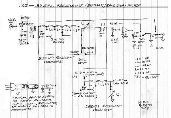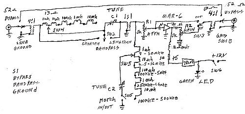 | Assembly Notes: * All wiring should be as short and direct as possible (see Richard's panel layout). * Ground all DC power connections to the metalic chassis. Do not use bypass capacitors from the power mains to ground as noise filters. * DC Isolation: Depending on your total system conditions and various other equipment, which is interconnected in your station, an electrical ground may, or may not increase noise - you may try it both ways. * Ground-bonding (Electrical/Lightning Safety) is very important for minimal noise (elimination of ground loops). Your station's Earth ground system should be electrically bonded to 1. the input of the preselector, 2. the preselector output and/or the input of your receiver, 3. the antenna selector switch (if used) and, 4. of course, the antenna(s) coax shield(s). * Redundant AC electrical (power mains) grounds may cause ground loops (your radio is probably connected to the mains ground through the line cord). In practical experimentation, I have found a well-regulated wall wart or table top power supply, with the DC outputs isolated from electrical ground, to work well. * Capacitors C1 and C2 should be mounted with nylon standoffs to keep the roter isolated from ground (shaft extensions may be required). |