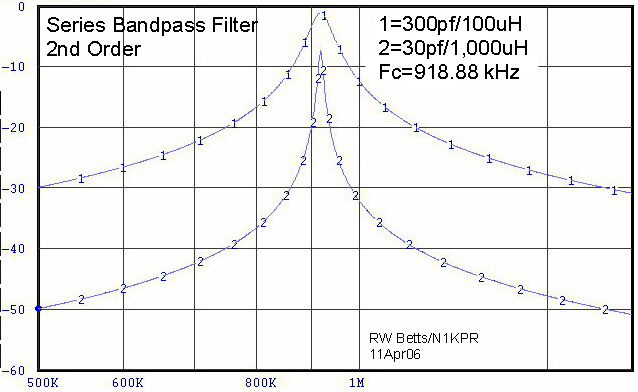 | When designing band pass, or band stop filters, the ratio of L to C will have an effect on the total circuit Q. Here is a BP filter centered in the AM broadcast band with a 10:1 ratio-shift of the L and C components. Note that when the C is high relative to the L value, the loss is minimal, but the filter Q is broadbanded. Conversely, when the L is high relative to the C component, the Q is increased, but the loss is greater. Coil loss will vary with the R component of the choke coil. The coils used here have a Q factor of 200 and the source and terminal loads are 12 Ohms. When the Q remains the same, as the ratios are changed, the result will be a proportional change in the R component. Additionally, when examining filter circuit analysis results, other factors must be considered. Band pass or band stop filters should not be designed solely on the basic resonance formula. There's why. A true balanced filter has "equal and opposite" reactances and phase shift on either side of the center frequency. This is the complementary condition associated with a symmetrical design - Butterworth-type filter - their characteristics are predictable.. However, when the reactance magnitude and phase shift angles in the C and L components are not equal and opposite, other resultant characteristics appear. This is NOT apparent in the simplified resonance formula which does not take into account such parameters (see curve # 2 below). NOTE: Since preselectors are parametric, each filter stage will be symmetrical at only one specific frequency - and no other, (every time you turn the inductor switch to another band, the capacitor can only select one specific Butterworth condition in that range). To further understand these conditions, I suggest the experimenter model the above conditions, IE; select a specific frequency and configure various L and C combinations to resonate at that frequency. Please note, in your results, the bandwidth (skirt angle or tightness) of the various pass bands of the various combinations - that is the final Q of the filter. This is demonstrated below using ELSIE (find on Google or Yahoo) filter analysis program (free). |