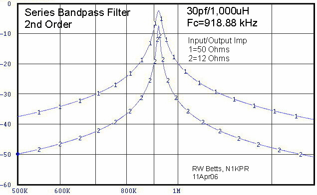 | Filter Q is dependent on the source and load impedance. Series resonant filters increase Q as impedance goes down. Parallel resonant filters (tank) increase Q as impedance increases. Here is a filter from above with a 4:1 impedance ratio change. It is obvious that the Q is higher in the 12 Ohm loop, but the loss is greater. In the higher impedance circuit there is less loss and a lower Q factor. For preselector design, curve 2 is most desirable. |